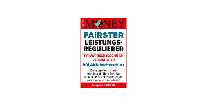 Die Roland Rechtsschutzversicherung wurde 2025 erneut als „Fairster Leistungsregulierer“ ausgezeichnet: Roland hat im Privat-Rechtsschutz-Test von Focus Money (Ausgabe 3/2025) nach 2022, 2023, 2024 auch in 2025 wieder die Bestnote „Sehr gut“ erhalten.