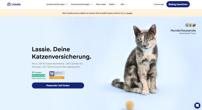 Lassie hat 3 verschiedene Versicherungstarife für den Krankenvollschutz Ihrer Katze im Portfolio: Mini, Midi und Maxi. Die monatliche Gebühr für den Tarif wird unter anderem vom Alter und der Lebensweise des Tieres beeinflusst (Freigänger oder Hauskatze). Auf der Webseite können Tierhalter die Gebühren für ihr Tier mit dem Rechner individuell ermitteln. Bei Fragen steht eine Chat-Funktion bereit.